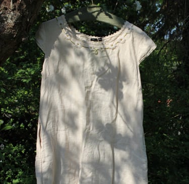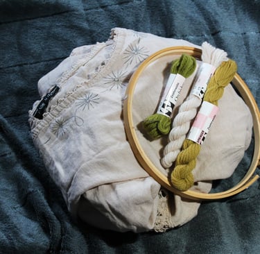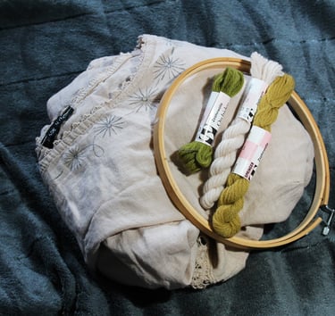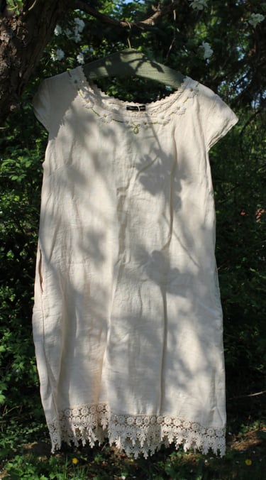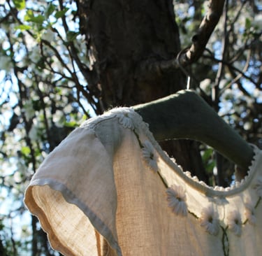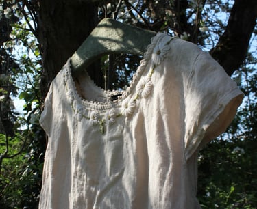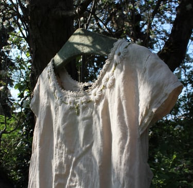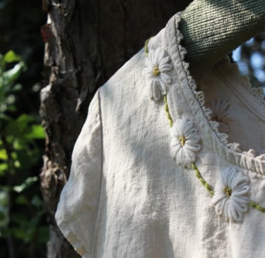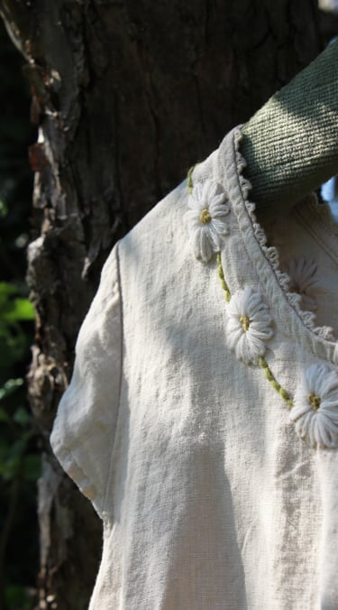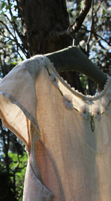 One beautiful spring morning, I'm sitting under the apple tree in my garden, enjoying a cup of coffee. I reflect on the past winter and the lessons I've learned. I let my gaze wander and fall upon the daisies that adorn the entire meadow surrounding the apple tree. "What a lovely beauty a daisy is..." I think, and am immediately inspired to honor my experience by embroidering it on the linen dress I recently purchased.